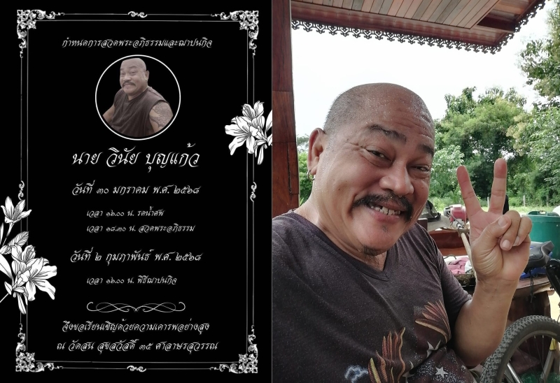 โดยลูกชาย เบาหวิว สะพานแขวน แจ้งข่าวผ่านเฟซบุ๊ก เบาหวิว สะพานแขวน ว่า “สวัสดีครับ ผมตังค์ ลูกชายพ่อวินัยตอนนี้พ่อผมเสียเเล้วนะครับ ขออนุญาตเรียนเชิญทุกท่าน เเละขอเเจ้งรายละเอียดงานสวดอภิธรรมเเละวันฌาปนกิจให้ไว้ตามรายละเอียดในภาพนี้ครับ