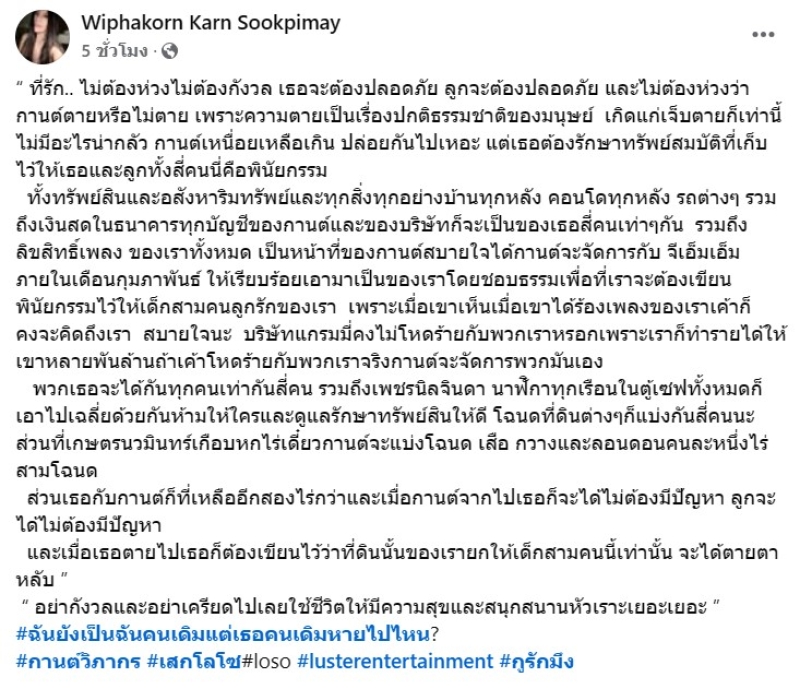 จากกรณีที่ก่อนหน้านั้น ด้านนักร้อง อย่าง เสกโลโซ ได้เข้าโรงพยาบาล ท่ามกลางความเป็นห่วงของแฟนๆกันจำนวนมาก ล่าสุด กานต์ วิภากร ก็ออกมาโพสต์ร่ายยาว เหมือนคำสั่งเสียกับครอบครัว ขณะที่ก่อนหน้านั้น เจ้าตัวได้ชี้แจงเรื่องการจัดการมรดก เรียบร้อยแล้ว ทำให้หลายคนเป็นกังวลถึงเรื่องอาการป่วยของ กานต์ โดยเจ้าตัวได้โพสต์ว่า ที่รัก.. ไม่ต้องห่วงไม่ต้องกังวล เธอจะต้องปลอดภัย ลูกจะต้องปลอดภัย และไม่ต้องห่วงว่ากานต์ตายหรือไม่ตาย เพราะความตายเป็นเรื่องปกติธรรมชาติของมนุษย์ เกิดแก่เจ็บตายก็เท่านี้ ไม่มีอะไรน่ากลัว กานต์เหนื่อยเหลือเกิน ปล่อยกันไปเหอะ แต่เธอต้องรักษาทรัพย์สมบัติที่เก็บไว้ให้เธอและลูกทั้งสี่คนนี่คือพินัยกรรม