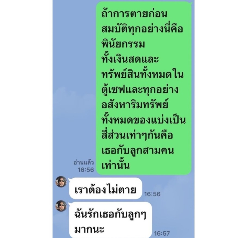 ทั้งทรัพย์สินและอสังหาริมทรัพย์และทุกสิ่งทุกอย่างบ้านทุกหลัง คอนโดทุกหลัง รถต่างๆ รวมถึงเงินสดในธนาคารทุกบัญชีของกานต์และของบริษัทก็จะเป็นของเธอสี่คนเท่าๆกัน รวมถึงลิขสิทธิ์เพลง ของเราทั้งหมด เป็นหน้าที่ของกานต์สบายใจได้กานต์จะจัดการกับ จีเอ็มเอ็มภายในเดือนกุมภาพันธ์ ให้เรียบร้อยเอามาเป็นของเราโดยชอบธรรมเพื่อที่เราจะต้องเขียนพินัยกรรมไว้ให้เด็กสามคนลูกรักของเรา เพราะเมื่อเขาเห็นเมื่อเขาได้ร้องเพลงของเราเค้าก็คงจะคิดถึงเรา สบายใจนะ บริษัทแกรมมี่คงไม่โหดร้ายกับพวกเราหรอกเพราะเราก็ทำรายได้ให้เขาหลายพันล้านถ้าเค้าโหดร้ายกับพวกเราจริงกานต์จะจัดการพวกมันเอง