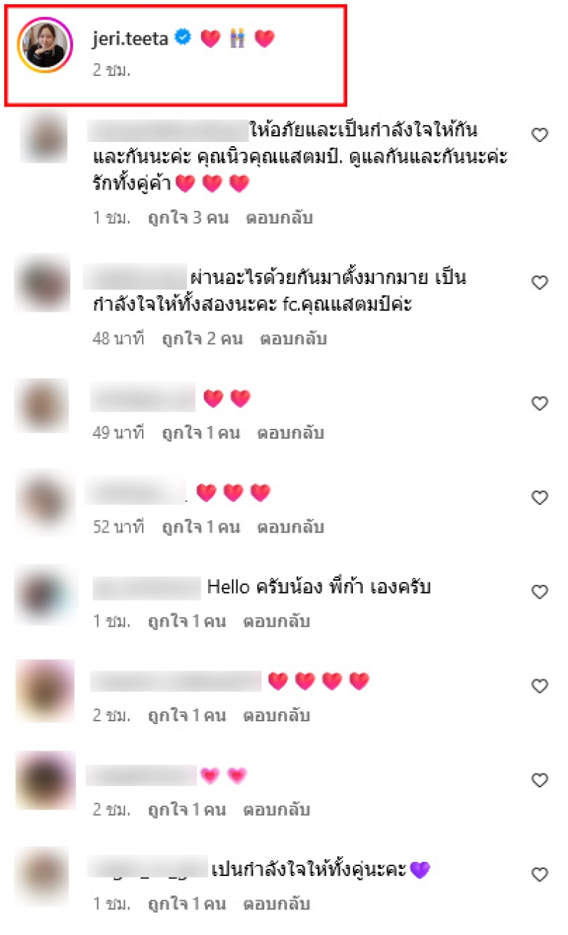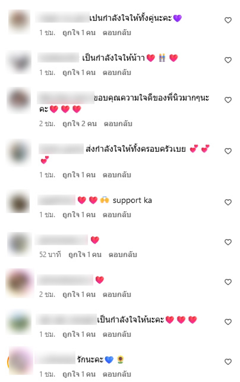 ท่ามกลางแฟนๆต่างเข้ามาคอมเมนต์ส่งกำลังใจกันอย่างมาก อาทิ ผ่านอะไรด้วยกันมาตั้งมากมาย เป็นกำลังใจให้ทั้งสองนะคะ fc.คุณแสตมป์ค่ะ,ขอบคุณความใจดีของพี่นิวมากๆนะคะ,ส่งกำลังใจให้ทั้งครอบครัวเลย เป็นต้น
