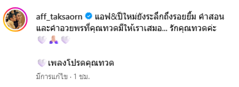 โดยเขียนข้อความว่า แอฟ&ปีใหม่ยังระลึกถึงรอยยิ้ม คำสอน และคำอวยพรที่คุณทวดมีให้เราเสมอ รักคุณทวดค่ะ ท่ามกลางแฟนๆเเละเพื่อนในวงการต่างเข้ามาคอมเมนต์ส่งกำลังใจเเละเเสดงความเสียใจกันอย่างมาก