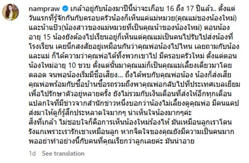 ล่าสุด ทำเอาด้านผู้จัดการส่วนตัวของ ใหม่ ดาวิกา อย่าง เกล้า น้ำพราว ได้ออกมาเคลื่อนไหวผ่านอินสตรแกรมส่วนตัว ในทำนองว่า ตั้งแต่รู้จักกับใหม่มา เห็นครอบครัวของน้องก็มีเพียงแค่แม่หมวย ซึ่งเป็นคุณแม่ของสาวใหม่ ที่คอยไปรับไปส่งน้องไปโรงเรียน เคยนึกสงสัยเหมือนกันว่าพ่อน้องไปไหน จนพอน้องเริ่มมีชื่อเสียง น้องก็ส่งเสีย ซื้อบ้านรถ รวมถึงพาคุณพ่อกลับประเทศเบลเยียมรักษาตัวอยู่หลายครั้ง ตนแปลกใจที่สำนักข่าวหนึ่งบอกน้องไม่เลี้ยงดูคุณพ่อ น่าเห็นใจน้องมากๆค่ะ