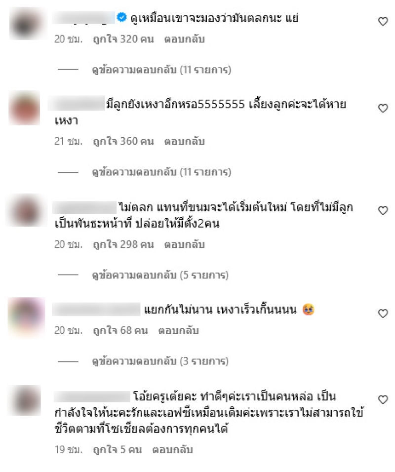 อาทิ ดูเหมือนเขาจะมองว่ามันตลกนะ แย่,มีลูกยังเหงาอีกหรอ5555555 เลี้ยงลูกค่ะจะได้หายเหงา,ไม่ตลก แทนที่ขนมจะได้เริ่มต้นใหม่ โดยที่ไม่มีลูก เป็นพันธะหน้าที่ ปล่อยให้มีตั้ง2คน,แยกกันไม่นาน เหงาเร็วเกิ๊น,มองว่าไม่ใช่เรื่องตลก เพราะมันคือจิตสำนึกที่ควรมีนะคะ เป็นต้น