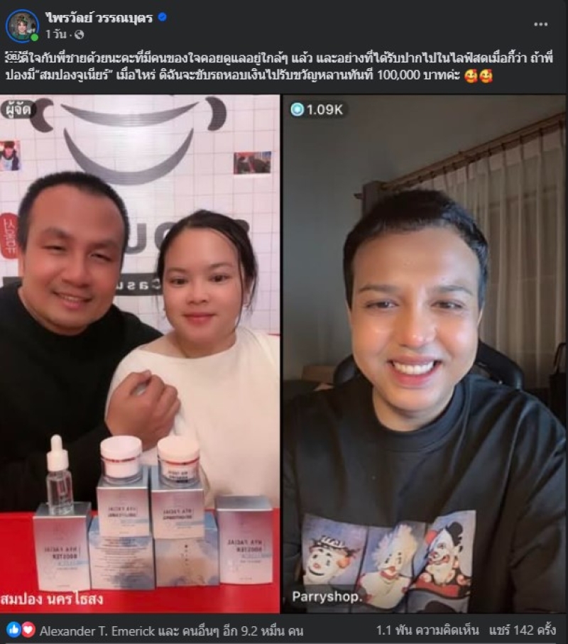 โดยด้าน แพรรี่ ไพรวัลย์ ก็ได้เข้ามาร่วมแสดงความยินดีภายในไลฟ์ พร้อมโพสต์ผ่านเฟสบุ๊กส่วนตัวว่า เซอร์ไพรส์มากค่ะ พี่ปองพูดในไลฟ์ว่าจะแต่งงานสิ้นปีนี้ น้ำตาจะไหลอ่ะ แต่งงานก่อนน้องได้ไง พร้อมกล่าวเสริมว่า หากพี่ปองมีสมปองจูเนียร์เมื่อไหร่ ดิฉันจะขับรถหอบเงินไปรับขวัญหลานที 100,000 บาทค่ะ ซึ่งก็ต้องบอกเลยว่า ทำเอาสร้างเสียงฮือฮาบนโลกโซเชียลเป็นอย่างมากเลยทีเดียว ทั้งนี้ ยังพากันเข้าไปร่วมแสดงความยินดีกับทั้งคู่กันอย่างล้นหลามกันเลยทีเดียว