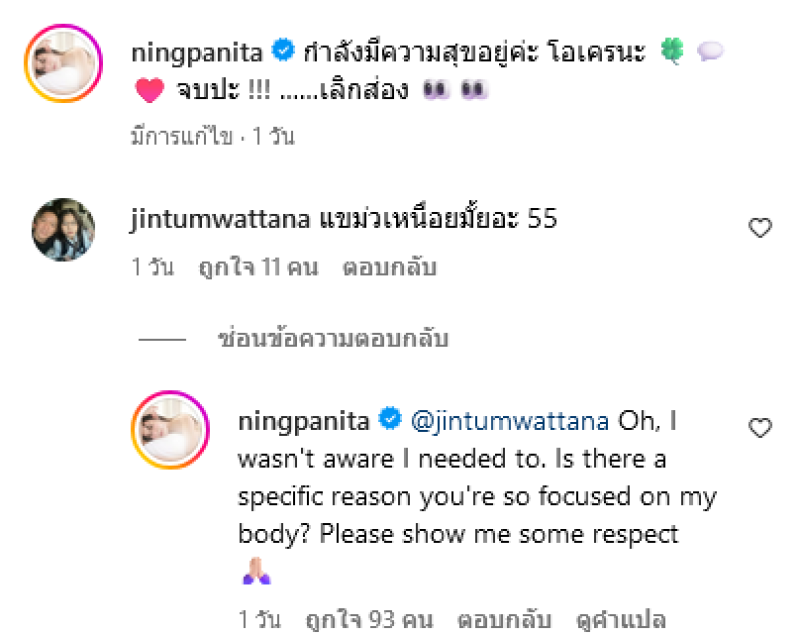 งานนี้ หนิง ปณิตาจึงได้ตอบกลับไปทันทีว่า Oh, I wasn't aware I needed to. Is there a specific reason you're so focused on my body? Please show me some respect (ฉันไม่รู้ว่าจําเป็นต้องทํา มีเหตุผลอะไรที่คุณสนใจเกี่ยวกับร่างกายของฉัน? กรุณาให้เกียรติฉันหน่อย)