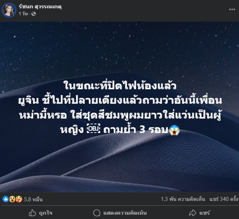 ก็ต้องบอกเลยว่า ทำเอาแฟนคลับที่ได้ฟัง ขนลุกกันเป็นแถบๆ เมื่อด้านนักร้องสาวลูกทุ่ง อย่าง เจนนี่ รัชนก หรือ เจนนี่ ได้หมดถ้าสดชื่น เล่าประสบการณ์ที่ลูกสาวพบเจอบุคคลปริศนา ขณะกำลังจะปิดไฟนอน พร้อมทักแรงทำขวัญผวาไม่หายกันเลยทีเดียว
