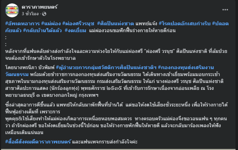 จากกรณีที่ก่อนหน้านี้ แม่ผ่องศรี วรนุช ศิลปินแห่งชาติ สาขาศิลปะการแสดง (นักร้องลูกทุ่ง) ได้มีอาการอ่อนเพลียจนเข้าโรงพยาบาลท่ามกลางแฟนๆต่างเป็นห่วง ล่าสุดทางด้านเพจเฟซบุ๊ค ดาราภาพยนตร์ ได้ออกมาโพสต์อัปเดตอาการล่าสุดว่า