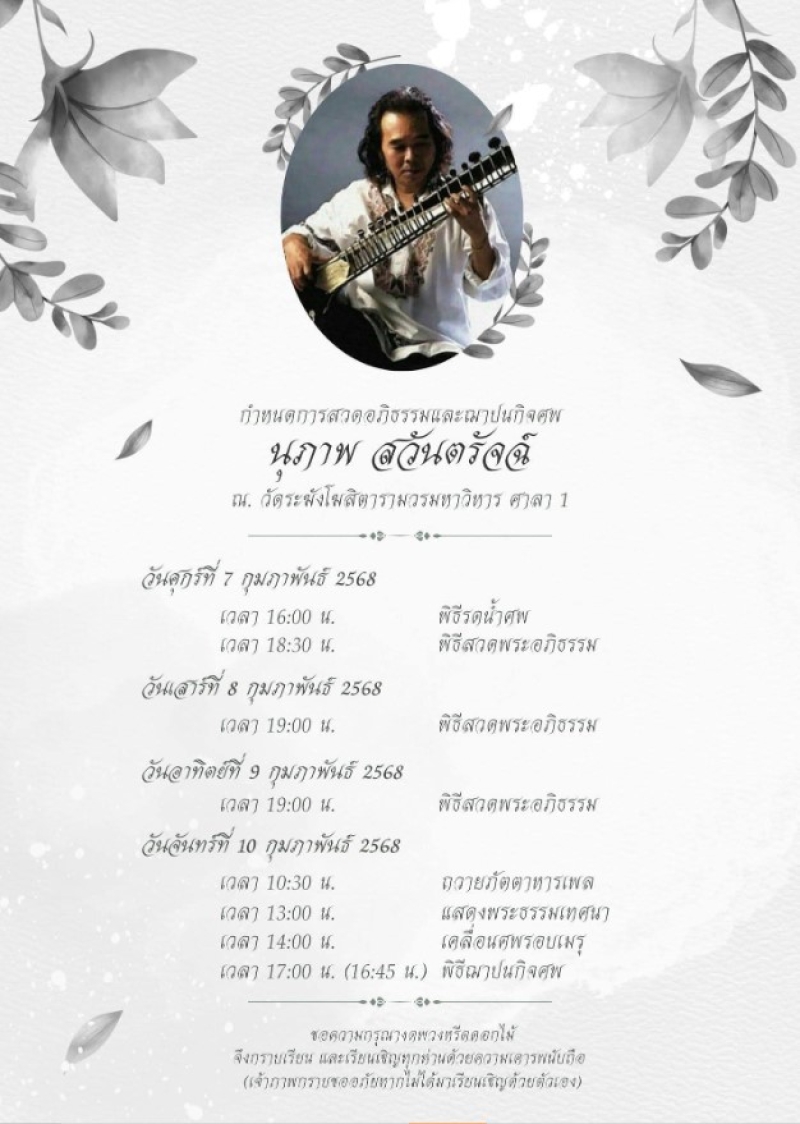 ขอความกรุณางดพวงหรีดดอกไม้ จึงกราบเรียน และเรียนเชิญทุกท่านด้วยความเคารพ (เจ้าภาพกราบขออภัยหากไม่ได้มาเรียนเชิญด้วยตัวเอง)