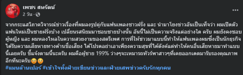 โดยระบุว่า จากกระแสวิภาควิจารณ์ข่าวเรื่องที่ผมลงรูปคู่กับแฟนเพลงชาวฝรั่ง และ นำมาโยงข่าวอันเป็นเท็จว่า ผมเปิดตัวแฟนใหม่เป็นชายฝรั่งบ้าง เปลี่ยนรสนิยมมาชอบชายบ้างนั้น อันนี้ไม่เป็นความจริงแต่อย่างใดครับ ผมยังคงชอบผู้หญิง และ ผมหลงไหลในความสวยงามของสตรีเพศ