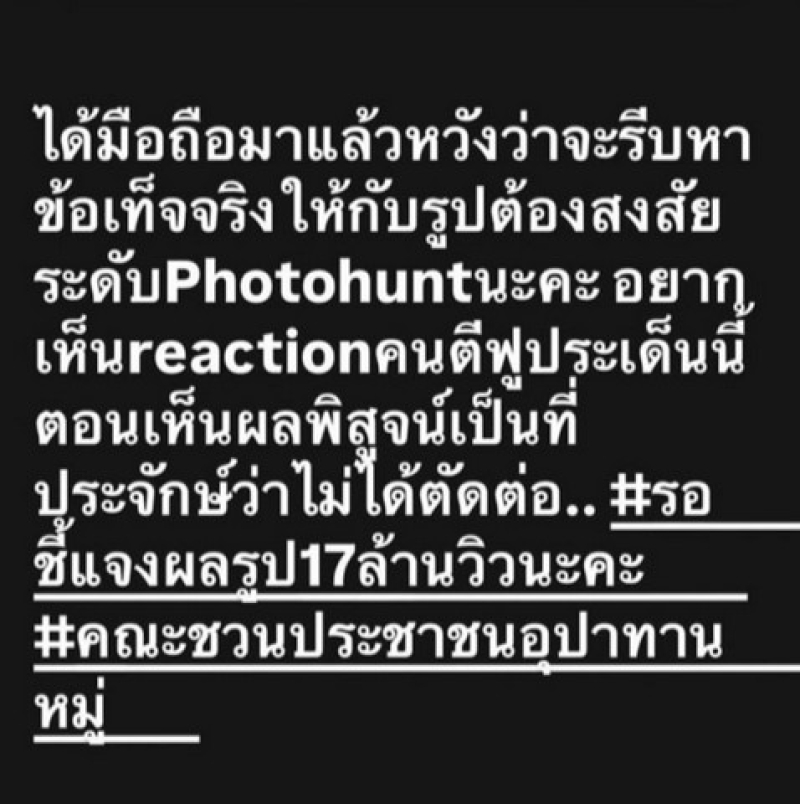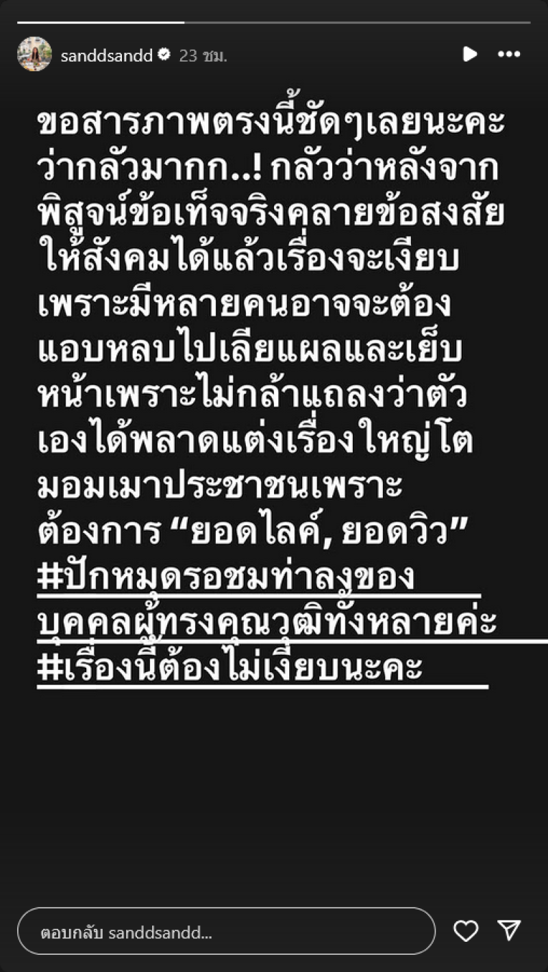 ต่อมาได้ลงสตอรี่อีกว่า ขอสารภาพตรงนี้ชัดๆ เลยนะคะว่ากลัวมากก..! กลัวว่าหลังจากพิสูจน์ข้อเท็จจริงคลายข้อสงสัยให้สังคมได้แล้วเรื่องจะเงียบเพราะมีหลายคนอาจจะต้องแอบหลบไปเลียนผลและเย็บหน้าเพราะไม่กล้าแถลงว่าตัวเองได้พลาดแต่งเรื่องใหญ่โตมอมเมาประชาชนเพราะต้องการ "ยอดไลค์, ยอดวิว"#ปักหมุดรอชมหาลงของบุคคลผู้ทรงคุณวุฒิทั้งหลายค่ะ #เรื่องนี้ต้องไม่เงียบนะคะ