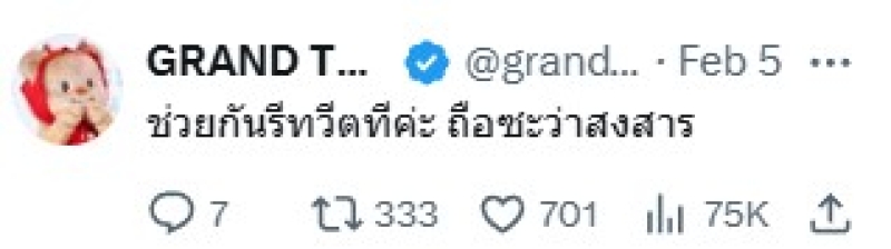 ล่าสุด ด้านสาวแกรนด์ ได้ออกมาโพสต์ร่วมเทรนด์ในหัวข้อ สิ่งที่ควรแมสและโลกควรได้เห็น โดยสาวเจ้าตัวเลือกที่จะโพสต์รูปตัวเอง พร้อมแคปชั่นฮาสุดสั้น ดังนี้ว่า โสด พร้อมวอนขอความเมตตา จากเหล่าชาวเน็ตที่เห็นช่วยรีโพสต์ เสมือนเป็นการช่วยโปรโมทให้โลกรับรู้เสียหน่อย ว่าตรงนี้ยังว่าง อีกทั้ง คอนเทนต์ดังกล่าวก็ทำขึ้นเพื่อรับเทศกาลวาเลนไทน์ ที่จะใกล้จะถึงเร็วๆนี้ งานนี้เรียกได้เลยว่า ทำเอาเหล่าคนบันเทิงและแฟนคลับ ถึงกับเข้ามาคอมเมนต์แห่แซว เป็นเสียงเดียวกันเลยว่า สวยและแมสขนาดนี้ คงโสดอีกไม่นานแน่นอน