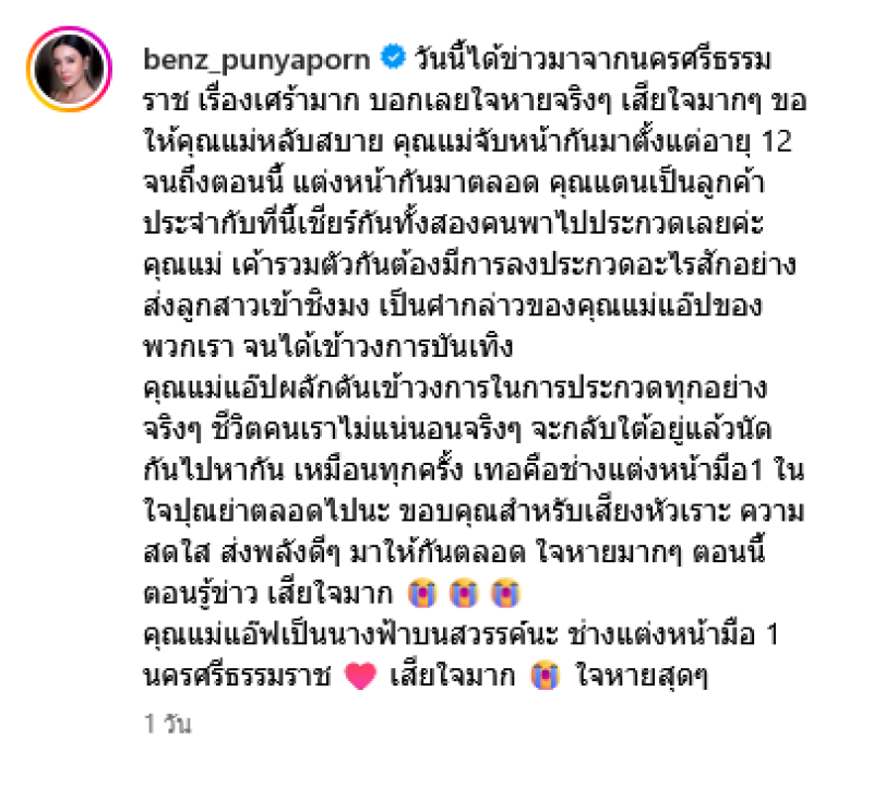 เรียกได้ว่าเป็นอีกหนึ่งข่าวเศร้าของดาราสาวอย่าง เบนซ์ ปุณยาพร ที่ล่าสุดได้ออกมาโพสต์ข้อความอาลัย แม่แอ๊ฟช่างแต่งหน้ามือ1 ในใจ ที่จับหน้ากันมาตั้งแต่อายุ 12 จนถึงตอนนี้ โดยโพสต์ผ่านทางอินสตาแกรมส่วนนตัว benz_punyaporn ระบุว่า วันนี้ได้ข่าวมาจากนครศรีธรรมราช เรื่องเศร้ามาก บอกเลยใจหายจริงๆ เสียใจมากๆ ขอให้คุณแม่หลับสบาย