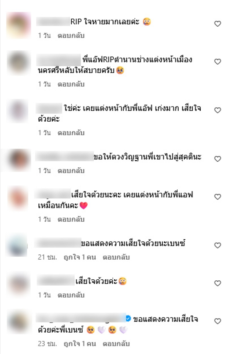 ชีวิตคนเราไม่แน่นอนจริงๆ จะกลับใต้อยู่แล้วนัดกันไปหากัน เหมือนทุกครั้ง เธอคือช่างแต่งหน้ามือ1 ในใจปุณย่าตลอดไปนะ ขอบคุณสำหรับเสียงหัวเราะ ความสดใส ส่งพลังดีๆ มาให้กันตลอด ใจหายมากๆ ตอนนี้ ตอนรู้ข่าว เสียใจมาก คุณแม่แอ๊ฟเป็นนางฟ้าบนสวรรค์นะ ช่างแต่งหน้ามือ 1 นครศรีธรรมราช เสียใจมาก ใจหายสุดๆ