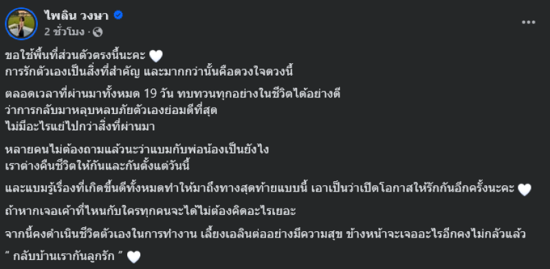 เรียกได้ว่าเป็นอีกหนึ่งนักร้องสาวเสียงดีสำหรับ แบม ไพลิน ที่ล่าสุดได้ออกมาโพสต์เคลียร์ความสัมพันธ์กับพ่อของลูกหลังหลายคนสงสัย โดยได้โพสต์ภาพขณะพาลูกสาวขึ้นเครื่องบินกลับบ้านเกิดพร้อมเขียนข้อความร่ายยาวผ่านทางเฟซบุ๊คส่วนตัว ไพลิน วงษา ระบุว่า ขอใช้พื้นที่ส่วนตัวตรงนี้นะคะ การรักตัวเองเป็นสิ่งที่สำคัญ และมากกว่านั้นคือดวงใจดวงนี้
