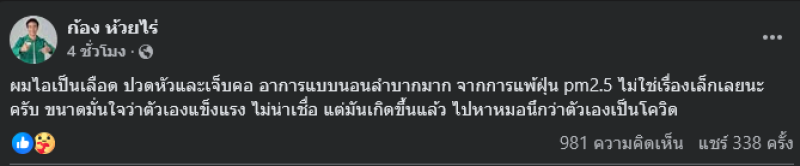 เรียกได้ว่าเป็นอีกหนึ่งนักร้องหนุ่มมากความสามารถสำหรับ ก้อง ห้วยไร่ ที่ล่าสุดได้ออกมาโพสต์เล่าประสบการณ์ไอเป็นเลือดเพราะฝุ่นpm2.5 ผ่านทางเฟซบุ๊คส่วนตัว ก้อง ห้วยไร่ โดยเล่าว่า ผมไอเป็นเลือด ปวดหัวและเจ็บคอ อาการแบบนอนลำบากมาก จากการแพ้ฝุ่น pm2.5 ไม่ใช่เรื่องเล็กเลยนะครับ ขนาดมั่นใจว่าตัวเองแข็งแรง ไม่น่าเชื่อ แต่มันเกิดขึ้นแล้ว ไปหาหมอนึกว่าตัวเองเป็นโควิด