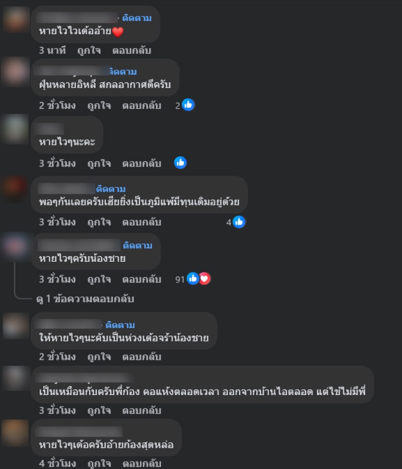 ทำเอาแฟนๆต่างเข้ามาคอมเมนต์ส่งกำลังใจกันอย่างมาก อาทิ ฝุ่นหลายอิหลี สกลอากาศดีครับ,หายไวๆครับอ้าย,หายไวๆครับน้องชาย,พอๆกันเลยครับเฮียยิ่งเป็นภูมิแพ้มีทุนเดิมอยู่ด้วย,หายไวๆเด้อครับอ้ายก้องสุดหล่อ,หายไวๆเด้อเพื่อน เป็นต้น