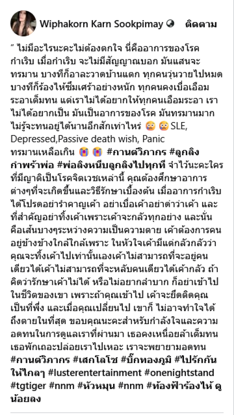 ทำเอาแฟนๆหลายคนต่างเป็นห่วงเเละให้คำแนะนำไม่น้อยเมื่อทางด้าน กานต์ วิภากร ได้ออกมาโพสต์คลิปร้องไห้พร้อมเขียนข้อความร่ายยาวผ่านเฟซบุ๊ค Wiphakorn Karn Sookpimay ระบุว่า ไม่มีอะไรนะคะ ไม่ต้องตกใจ นี่คืออาการของโรคกำเริบ เมื่อกำเริบ จะไม่มีสัญญาณบอก มันแสนจะทรมาน บางทีก็อาละวาดบ้านแตก ทุกคนวุ่นวายไปหมด