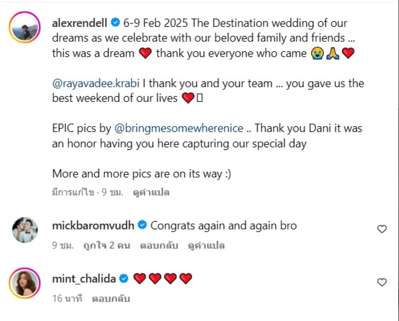 ล่าสุด อเล็กซ์ เรนเดลล์ ควงแฟนสาวนอกวงการเข้าสู่ประตูวิวาห์อีกครั้ง สุดโรแมนติกริมทะเลกระบี่ งานนี้จัดขึ้นในรูปแบบ "Destination Wedding" แบบเอ็กซ์คลูซีฟ เชิญเฉพาะคนสนิทมาร่วมเป็นสักขีพยานในวันสำคัญของทั้งคู่ โพสต์ภาพโมเมนต์แห่งความสุขลงอินสตาแกรม พร้อมแคปชั่นซึ้งๆ ว่า