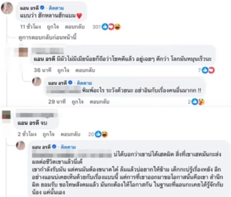 ล่าสุด ด้านนักร้องลูกทุ่งเสียงดี อย่าง แอน อรดี ได้ออกมาเคลื่อนไหวผ่านโลกโซเชียลให้กำลังใจ ในทำนองว่า แบบว่า ฮักหลาน ฮักแบม พร้อมอิโมจิหัวใจสีแดง ก่อนจะมีชาวเน็ตมือดีรายหนึ่งได้พิมพ์แซะสาวแอนว่า มีผัวไม่มีเมียน้อย ก็ถือว่าโชคดีแล้ว อยู่เฉยๆดีกว่า โลกมันหมุนเร็วนะ โดนในเวลาต่อมา ด้านแอน ก็ได้ออกมาตอบเมนต์ดังกล่าวว่า พิมพ์อะไร โปรดระวัง อย่าอินกับเรื่องคนอื่นมาก พร้อมเผยต่อว่า ไม่ได้บอกว่าเขาไม่ผิด สิ่งที่เขาทำมันก็ส่งผลต่อชีวิตเขาแล้ว เขากำลังรับมัน แต่คนมันจะขนาดไหน ล้มแล้วไม่อยากให้ข้าม เด็กไม่ได้รู้เรื่องอะไร