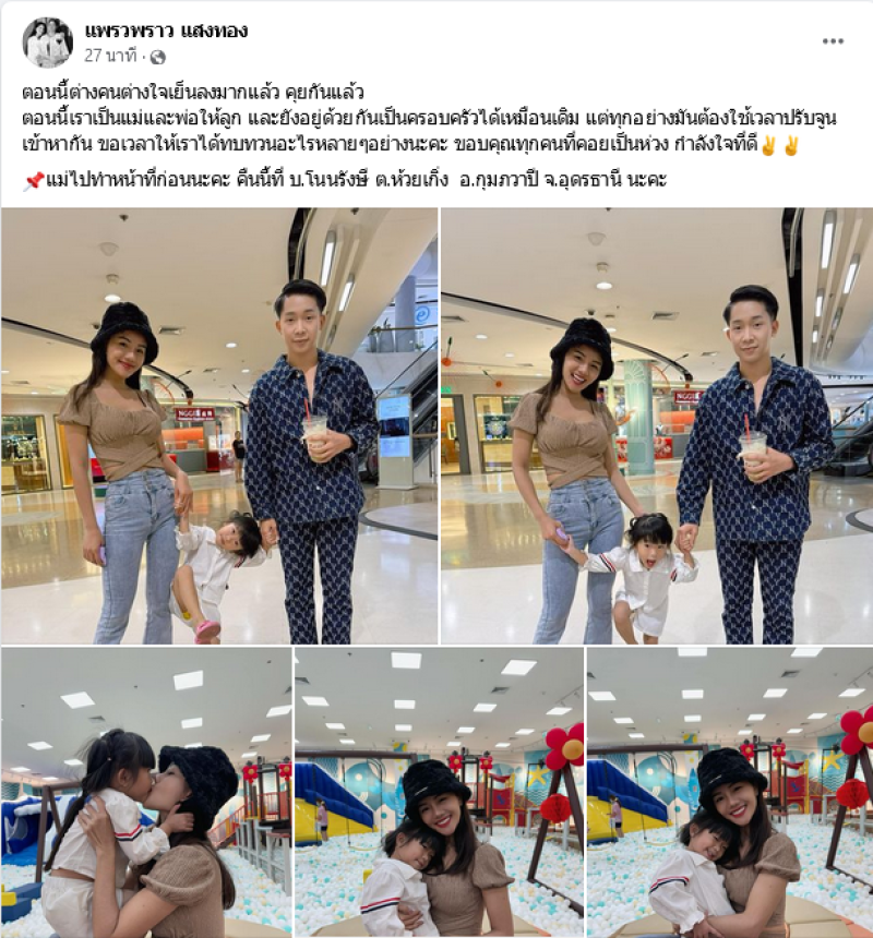ล่าสุดด้าน แพรวพราว แสงทอง ได้ออกมาเคลือนไหวล่าสุด โดยโพสต์ภาพคู่ ผู้ใหญ่บ้านและลูกสาว พร้อมระบุว่า ตอนนี้ต่างคนต่างใจเย็นลงมากแล้ว คุยกันแล้ว ตอนนี้เราเป็นแม่และพ่อให้ลูก และยังอยู่ด้วยกันเป็นครอบครัวได้เหมือนเดิม แต่ทุกอย่างมันต้องใช้เวลาปรับจูนเข้าหากัน ขอเวลาให้เราได้ทบทวนอะไรหลายๆอย่างนะคะ ขอบคุณทุกคนที่คอยเป็นห่วง กำลังใจที่ดี แม่ไปทำหน้าที่ก่อนนะคะ คืนนี้ที่ บ.โนนรังษี ต.ห้วยเกิ่ง อ.กุมภวาปี จ.อุดรธานี นะคะ