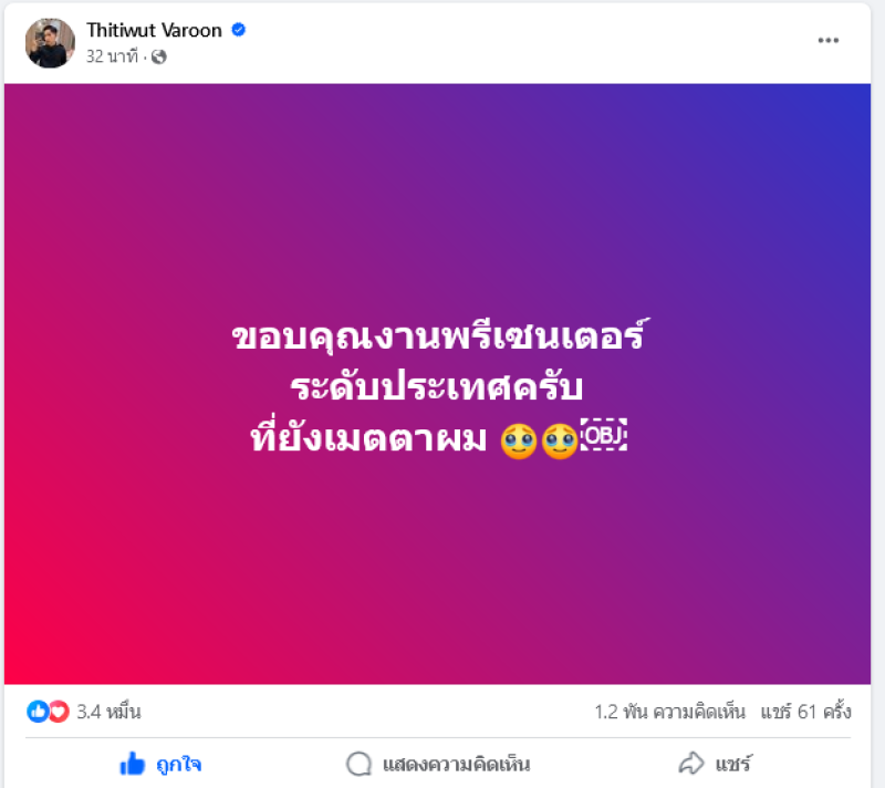 ล่าสุด ผู้ใหญ่บ้านฟินแลนด์ ได้ออกมาโพสต์ข่าวดีอีกแล้ว โดยได้ระบุว่า ขอบคุณงานพรีเซนเตอร์ ระดับประเทศครับ ที่ยังเมตตาผม