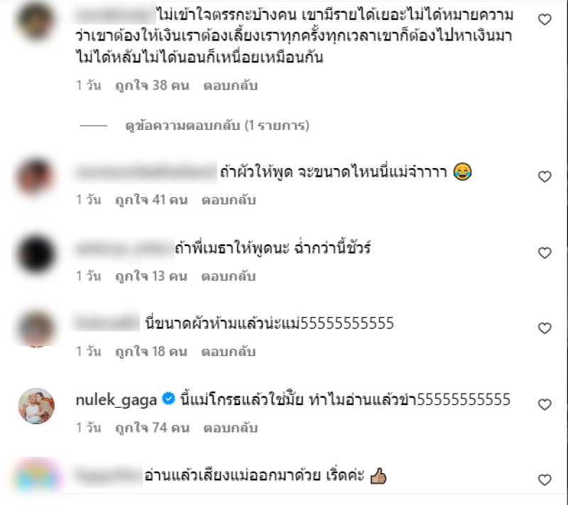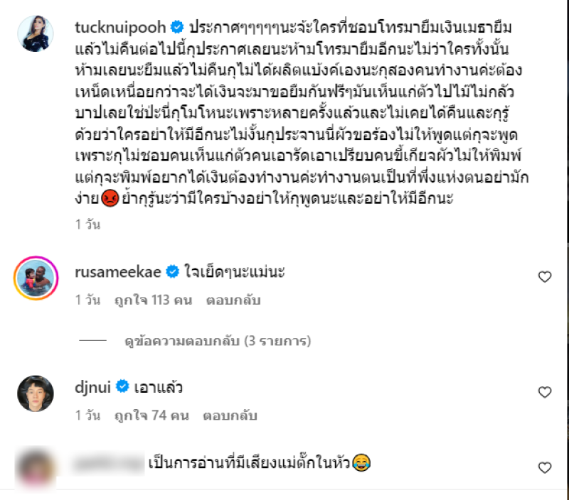 เรียกได้ว่า เป็นสาวแซ่บตัวแม่เลยก็ว่าได้ อย่าง ตั๊ก ศิริพร อยู่ยอด ที่มีผลงานมากมายในวงการบันเทิง ซึ่งแม่ตั๊กได้ออกมาเผยความแซ่บผ่านทางอินสตาแกรมบ่อยๆ ล่าสุดแม่ออกมาโพสต์เดือด กลางอินสตาแกรม พร้อมระบุข้อความว่า ประกาศๆๆๆๆๆนะจ้ะใครที่ชอบโทรมายืมเงินเมธายืมแล้วไม่คืนต่อไปนี้กุประกาศเลยนะห้ามโทรมายืมอีกนะไม่ว่าใครทั้งนั้นห้ามเลยนะยืมแล้วไม่คืนกุไม่ได้ผลิตแบ้งค์เองนะกุสองคนทำงานค่ะต้องเหน็ดเหนื่อยกว่าจะได้เงินจะมาขอยืมกันฟรีๆมันเห็นแก่ตัวไปไม๊ไม่กลัวบาปเลยใช่ป่ะนี่กุโมโหนะเพราะหลายครั้งแล้วและไม่เคยได้คืนและกุรู้ด้วยว่าใครอย่าให้มีอีกนะไม่งั้นกุประจานนี่ผัวขอร้องไม่ให้พูดแต่กุจะพูดเพราะกุไม่ชอบคนเห็นแก่ตัวคนเอารัดเอาเปรียบคนขี้เกียจผัวไม่ให้พิมพ์แต่กุจะพิมพ์อยากได้เงินต้องทำงานค่ะทำงานตนเป็นที่พึ่งแห่งตนอย่ามักง่าย ย้ำกุรู้นะว่ามีใครบ้างอย่าให้กุพูดนะและอย่าให้มีอีกนะ