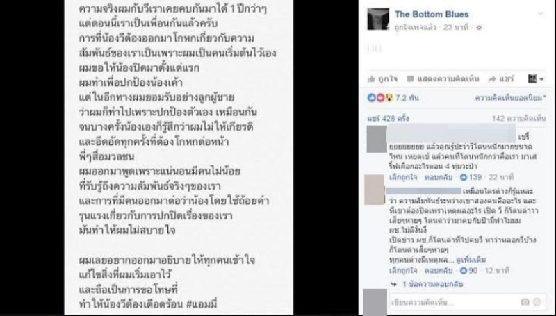 ผมออกมาพูดเพราะแน่นอนมีคนไม่น้อยที่รับรู้ถึงความสัมพันธ์จริงๆ ของเรา และการที่มีคนออกมาต่อว่าน้องโดยใช้ถ้อยคำรุนแรงเกี่ยวกับการปกปิดของเรามันทำให้ผมไม่สบายใจ ผมเลยอยากออกมาอธิบายให้ทุกคนเข้าใจ แก้ไขสิ่งที่ผมเริ่มเอาไว้ และถือเป็นการขอโทษที่ทำให้น้องต้องเดือดร้อน #แอมมี่
