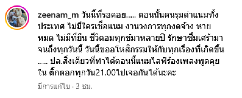 โดยเขียนข้อความว่า วันนี้ที่รอคอย..... ตอนนั้นคนรุมด่าแนมทั้งประเทศ ไม่มีใครเชื่อแนม งานวงการทุกงดจ้าง หายหมด ไม่มีที่ยืน ชีวิตอมทุกข์มาหลายปี รักษาซึมเศร้ามาจนถึงทุกวันนี้ วันนี้ขออโหสิกรรมให้กับทุกเรื่องที่เกิดขึ้น..... ปล.สิ่งเดียวที่ทำได้ตอนนี้แนมไลฟ์ร้องเพลงพูดคุยใน ติ๊กตอกทุกวัน21.00ไปเจอกันได้นะคะ