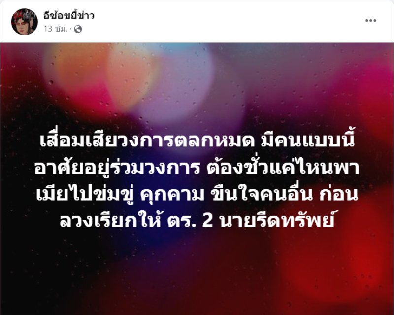 เรียกได้ว่า มีเรื่องมาให้ไม่ได้พักเลย วงการตลกฉาว เพจดังแฉ ผัวพาเมียไปข่มขู่คุกคามขืนใจเหยื่อ ก่อนลวงเรียกให้ ตร. 2 นายรีดทรัพย์ เรียกร้องสามคมศิลปินตลก ตั้งคณะกรรมการสอบสวน ล่าสุด เพจอีกี้ขยี้ข่าว ได้โพสต์แฉว่า ตลกพาเมียไปข่มขู่ ขูดรีดคุกคาม ขืนใจคนอื่น เพื่อหวังรีดทรัพย์ โดยระบุว่า เสื่อมเสียวงการตลกหมด มีคนแบบนี้อาศัยอยู่ร่วมวงการ ต้องชั่วแค่ไหนพาเมียไปข่มขู่ คุกคาม ขืนใจคนอื่น ก่อนลวงเรียกให้ ตร. 2 นายรีดทรัพย์