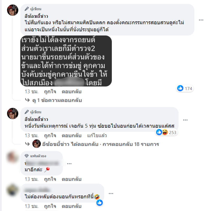 เพจอีกี้ ยังยังเผยข้อความของผู้เสียหาย ที่ระบุว่า เรายังไม่ได้ลงจากรถส่วนตัวเราเลย ก็มีตำรวจ2นาย ขึ้นมาบนรถส่วนตัวของข้า และข่มจขู่คุกคาม ขืนใจข้าให้ไป สภ.