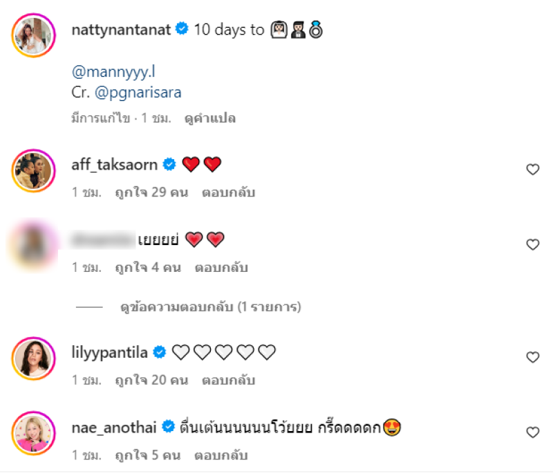 ล่าสุด สาวนัตตี้ ได้ออกมาโพสต์และอัปเดตงานแต่งที่ใกล้จะถึงนี้ โดยได้ระบุข้อความว่า 10 days to ออร่าเจ้าสาวออกเต็มมาก สวยจริงๆ แฟนๆอดใจรอไม่ไหวแล้วจ้า