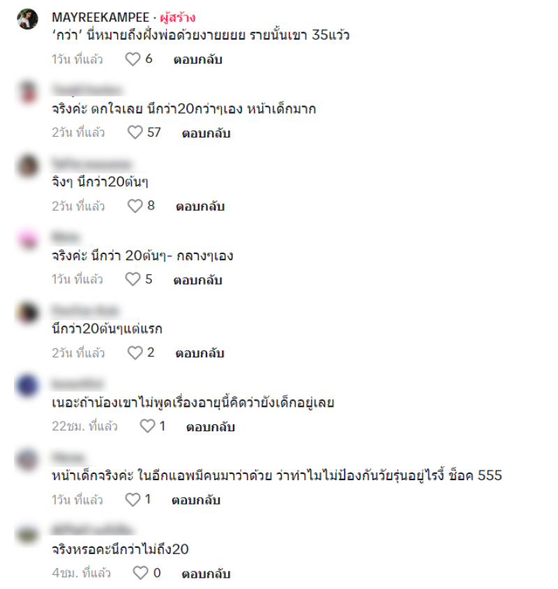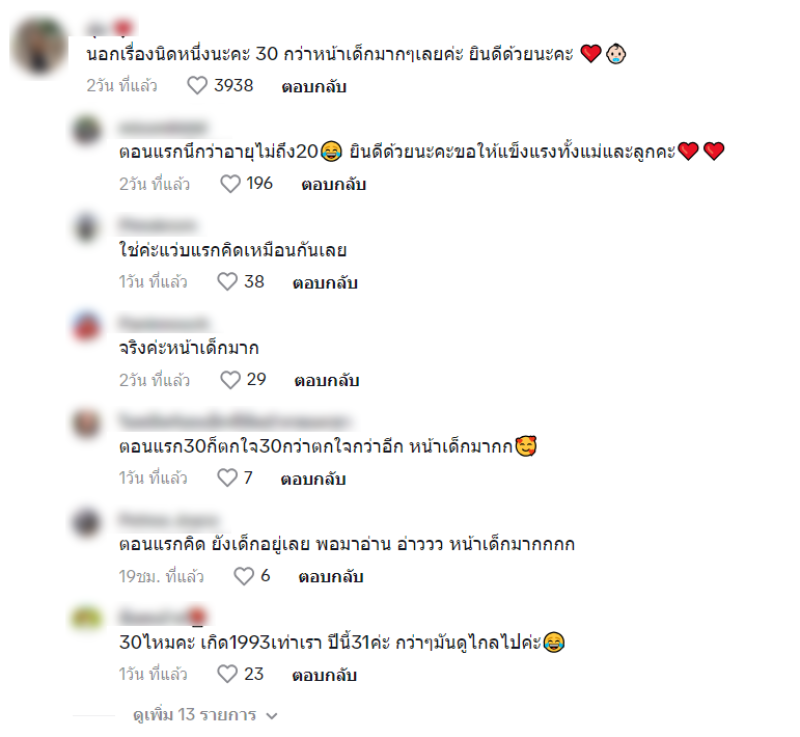 งานนี้ชาวเน็ตก็เข้ามาคอมเมนต์กันจำนวนมาก อาทิ หืมคุณแม่หน้าเด็กมาก คิดว่ายังไม่30เลยย เป็นกำลังใจให้นะคะ,นอกเรื่องนิดหนึ่งนะคะ 30 กว่าหน้าเด็กมากๆเลยค่ะ ยินดีด้วยนะคะ ,ตอนแรกนึกว่าอายุไม่ถึง20 ยินดีด้วยนะคะขอให้แข็งแรงทั้งแม่และลูกคะ,ตอนแรก30ก็ตกใจ30กว่าตกใจกว่าอีก หน้าเด็กมากก,ตอนแรกคิด ยังเด็กอยู่เลย พอมาอ่าน อ่าววว หน้าเด็กมากกกก เป็นต้น