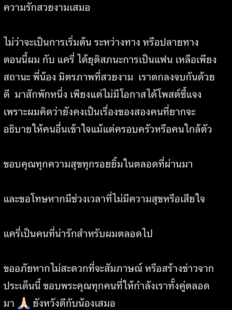 จากกรณีที่ก่อนหน้านั้น นักร้องลูกทุ่ง อย่าง เบิ้ล ปทุมราช ที่ได้ออกมาประกาศ เลิกรากับแฟนสาวแล้ว โดยได้โพสต์ข้อความว่า ความรักสวยงามเสมอ ไม่ว่าจะเป็นการเริ่มต้น ระหว่างทาง หรือปลายทาง ตอนนี้ผมกับแครี่ ได้ยุติสถานะการเป็นแฟน เหลือเพียง สถานะพี่น้อง มิตรภาพที่สวยงาม เราตกลงจบกันด้วยดีมาพีกหนึ่งแล้ว แพียงแต่ไม่มีโอกาสได้โพสต์ชี้แจง เพราะผมคิดว่ายังคงเป็นเรื่องของคนสองคนที่ยากจะอธิบายให้คนอื่นเข้าใจแม้แต่ครอบครัวหรือคนใกล้ตัว ขอบคุณทุกความสุขทุกรอยยิ้ม ในตลอดเวลาที่ผ่านมา และขอโทษหากมีช่วงเวลาที่ไม่มีความสุขหรือเสียใจ แครี่เป็นคนที่น่ารักสำหรับผมตลอดไป ขออภัยหากไม่สะดวกที่จะสัมภาษณ์ หรือสร้างข่าวจากประเด็นนี้ ขอบคุณทุกคนที่ให้กำลังใจเราทั้งคู่ตลอดมา ยังหวังดีกับน้องเสมอ