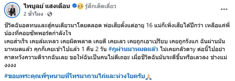 ต่อมา ครูไพบูลย์ ยังได้โพสต์ข้อความผ่านเฟซบุ๊คอีกว่า ชีวิตฉันอดทนและสู้คนเดียวมาโดยตลอด พ่อเสียตั้งแต่อายุ 16 แม่ก็เพิ่งเสียได้ปีกว่า เหลือแค่พี่น้องที่คอยซัพพอร์ตกำลังใจ เคยสำเร็จ เคยล้มเหลว เคยผิดพลาด เคยดี เคยเลว เคยถูกเอาเปรียบ เคยถูกรังแก ฉันผ่านมันมาหมดแล้ว คุกก็เคยเข้าไปแล้ว 1 คืน 2 วัน #กูผ่านมาหมดแล้ว ไม่เคยกลัวตาย ต่อนี้ไปอย่าคาดหวังความดีจากฉันเลย ขอให้ฉันเป็นคนไม่ดีเถอะ เผื่อชีวิตฉันมันจะดีขึ้นหรือเลวลง ช่างแม่งงงง #ขอบพระคุณพี่ๆทนายที่โทรมาถามไถ่และห่วงใยครับ