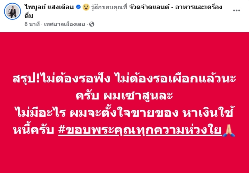 สุดท้าย ยังได้โพสต์ข้อความเสริมอีกว่า สรุป! ไม่ต้องรอฟัง ไม่ต้องรอเผือกแล้วนะครับ ผมเซาสูนละ ไม่มีอะไร ผมจะตั้งใจขายของ หาเงินใช้หนี้ครับ #ขอบพระคุณทุกความห่วงใย