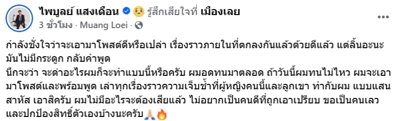 โดย ครูไพบูลย์ แสงเดือน ได้ออกมาเผยว่า กำลังชั่งใจว่าจะเอามาโพสต์ดีหรือเปล่า เรื่องราวภายในที่ตกลงกันแล้วด้วยดีแล้ว แต่ลิ้นอะนะมันไม่มีกระดูก กลับคำพูดนึกจะว่า จะด่าอะไรผมก็จะทำแบบนี้หรือครับ ผมอดทนมาตลอด ถ้าวันนี้ผมทนไม่ไหว ผมจะเอามาโพสต์และพร้อมพูด เล่าทุกเรื่องราวความเจ็บช้ำที่ผู้หญิงคนนี้และลูกเขา ทำกับผม แบบแสนสาหัส เอาสิครับ ผมไม่มีอะไรจะต้องเสียแล้ว ไม่อยากเป็นคนดีที่ถูกเอาเปรียบ ขอเป็นคนเลวและปกป้องสิทธิ์ตัวเองบ้างนะครับ