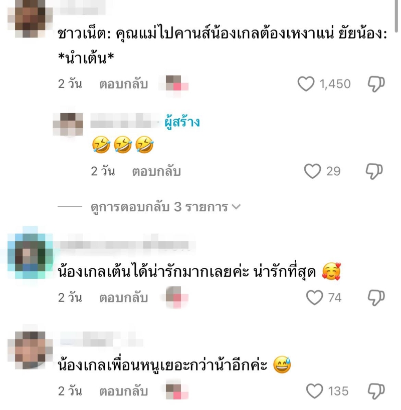 อีกทั้งยัง คอมเมนต์แซวกันสนั่นโซเชียล เช่น ชาวเน็ต : คุณแม่ไปคานส์น้องเกลต้องเหงาแน่ๆ ยัยน้อง : นำเต้น , น้องเกลเต้นได้น่ารักมากเลยค่ะ น่ารักที่สุด , น้องเกลเพื่อนหนูเยอะกว่าน้าอีกค่ะ เป็นต้น
