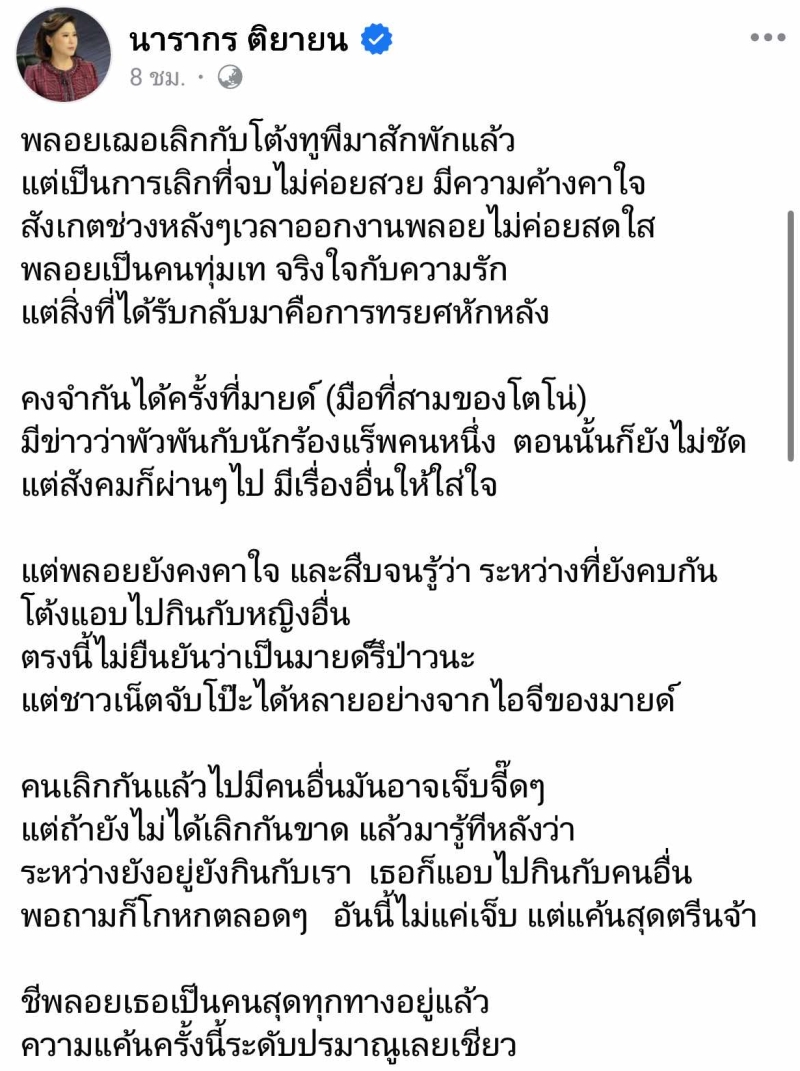 ล่าสุด พิธีกรชื่อดังอย่าง ต๊ะ นารากร ได้ออกมาโพสต์ลงโซเชียลส่วนตัว ถึงเรื่องดราม่ากลางดึกของ พลอย