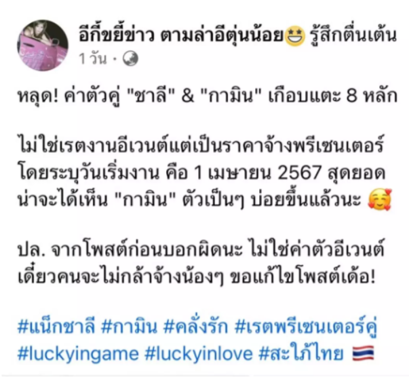 ปล. จากโพสต์ก่อนบอกผิดนะ ไม่ใช่ค่าตัวอีเวนต์ เดี๋ยวคนจะไม่กล้าจ้างน้องๆ ขอแก้ไขโพสต์เด้อ! #แน็กชาลี #กามิน #คลั่งรัก #เรตพรีเซนเตอร์คู่ #luckyingame #luckyinlove #สะใภ้ไทย"