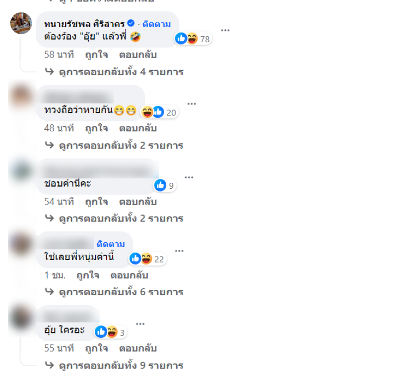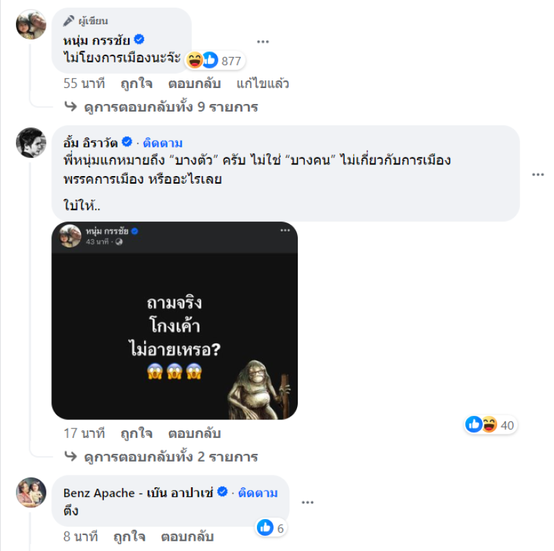 งานนี้ ทำเอาหลายคนมาคอมเมนตืกันจำนวนมาก ทาง อั้ม อิราวัต ก็เข้ามาเมนต์กลับว่า พี่หนุ่มแกหมายถึง บางตัว ครับ ไม่ใช่ บางคน ไม่เกี่ยวกับการเมือง พรรคการเมือง หรืออะไรเลย ใบ้ให้.. และด้านชาวเน็ตก็แสดงความคิดเห็นกันจำนวนมาก