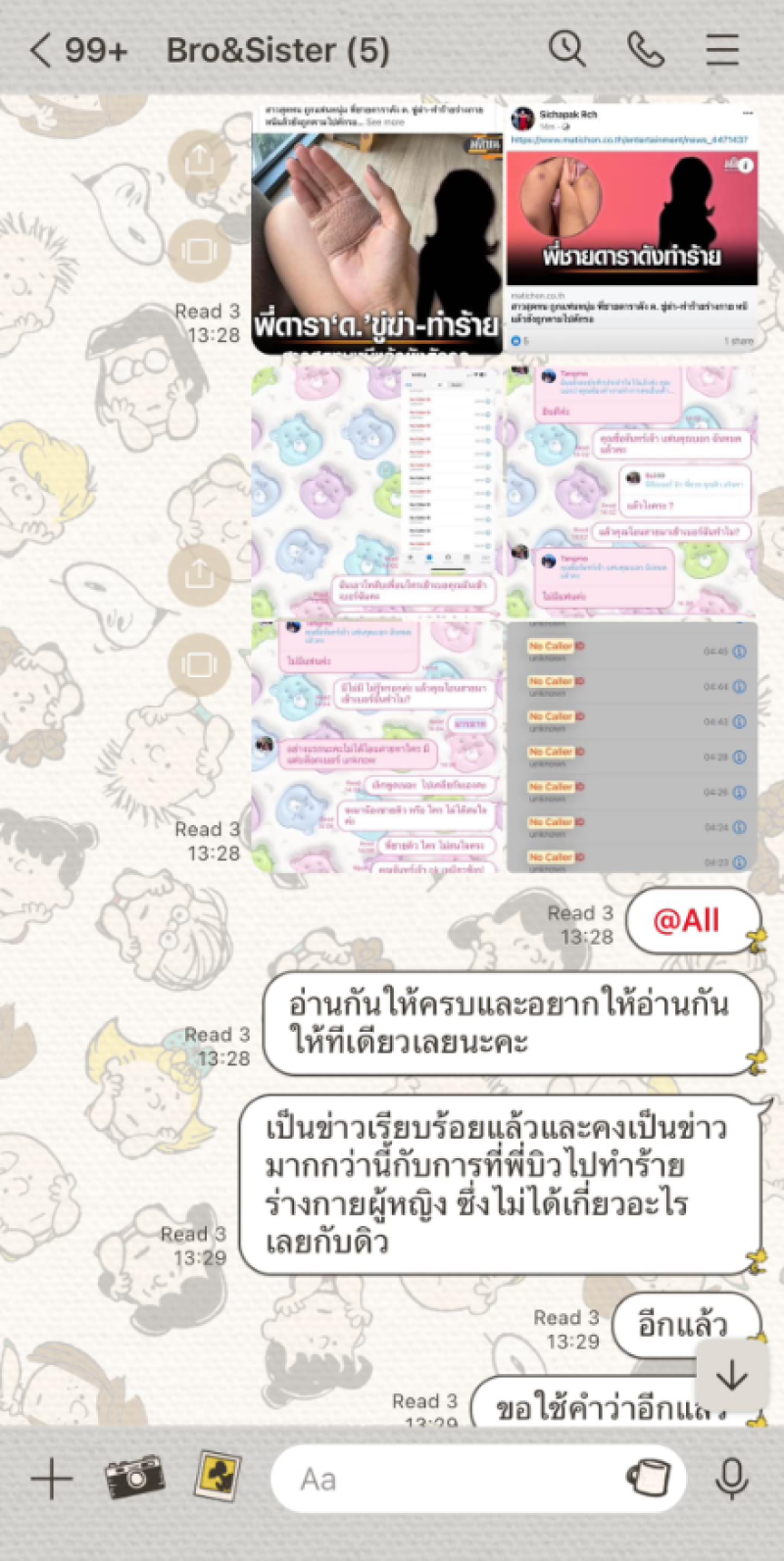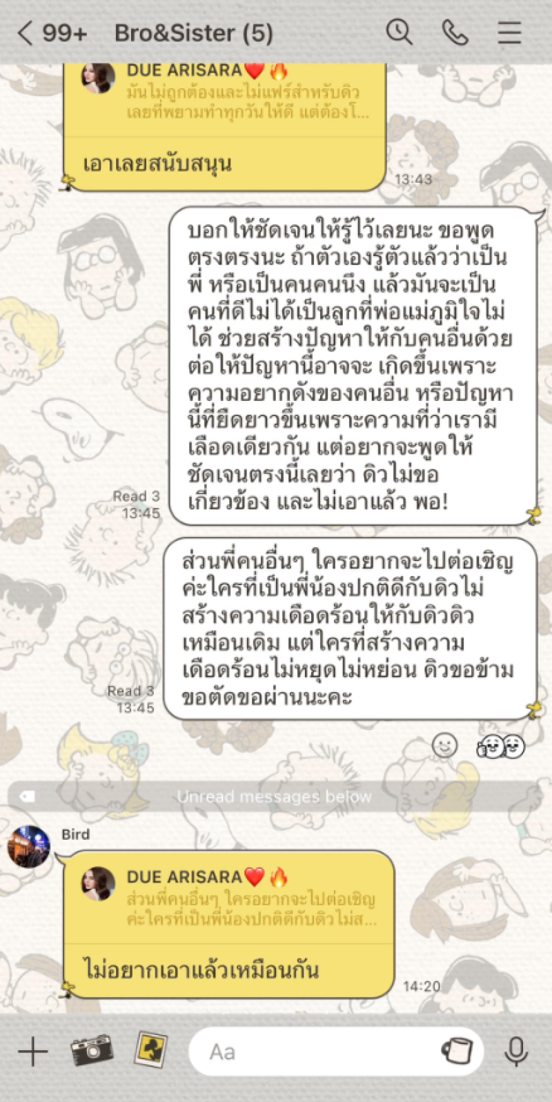 อยากขอความยุติธรรมให้กับดิวด้วย คนเราผิดก็คือผิดถูกก็คือถูก โดนทำร้ายคนที่มันทำร้ายก็คือคนผิด แต่ไม่ควรใช้ประโยชน์จากคนอื่นที่เขาไม่เกี่ยวข้องมาสร้างประโยชน์ให้กับตัวเอง ชื่อเสียงการเป็นที่รู้จักสมัยนี้มันมีวิธีมากมายที่ทำได้ด้วยคุณงามความดี ไม่จำเป็นต้องใช้ประโยชน์จากคนที่ไม่เกี่ยวข้องและทำให้เค้าเดือดร้อนไปด้วย ในส่วนของพี่ชายของดิว ดิวขออนุญาตแนบแชทที่ดิวได้มีการคุยกับพี่ชาย ในกรุ๊ปพี่น้องให้ทุกคนอ่านและเข้าใจอย่างแจ่มแจ้งเลยนะคะ ไม่เคยเข้าข้าง ไม่เคยเห็นดีเห็นงาม ไม่เคยภูมิใจ หรือสนับสนุนสิ่งต่างๆที่เค้าเป็นเลยค่ะ