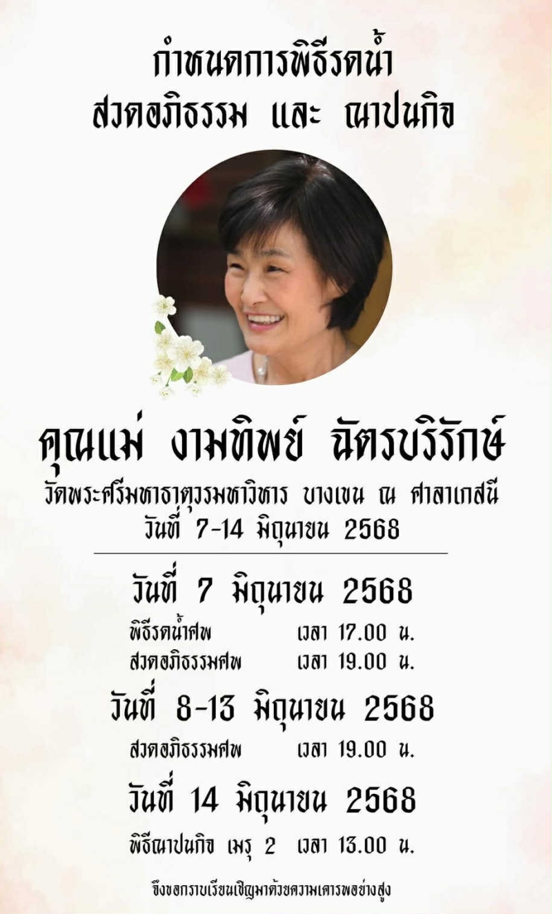 ล่าสุด คุณแม่ งามทิพย์ วัย 68 ปี จากไปอย่างสงบ ท่ามกลางความโศกเศร้าของคนในครอบครัว และแฟนคลับ โดยบอย ปกรณ์ แจ้งเพียงกำหนดการพิธีทางศาสนาเท่านั้น ยังไม่มีการกล่าวถึงสาเหตุการเสียชีวิตอย่างเป็นทางการ