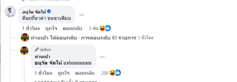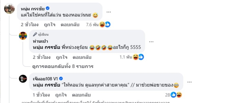 งานนี้ทำให้ พิธีกร-นักข่าวดัง อย่าง หนุ่ม กรรชัย รีบเข้ามาคอมเมนต์ทันทีเช่นกันว่า 'แต่ไม่ใช่คนที่ใส่แว่น ของหอแว่นนะ' และทาง อนุวัต จัดให้ ก็เข้ามาคอมเมนต์เช่นกันว่า ดีนะที่ขาดำ ขนขาเพียบ