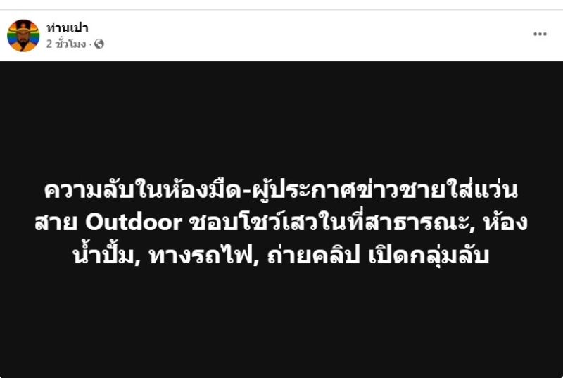 เรียกได้ว่า มีเรื่องราวที่ต้องให้ชาวเน็ตมาสืบกันอีกแล้ว เมื่อทางเพจดัง อย่าง ท่านเปา ได้ออกมาแฉวงการข่าว ว่า ความลับในห้องมืด-ผู้ประกาศข่าวชายใส่แว่น สาย Outdoor ชอบโชว์เสวในที่สาธารณะ, ห้องน้ำปั้ม, ทางรถไฟ, ถ่ายคลิป เปิดกลุ่มลับ