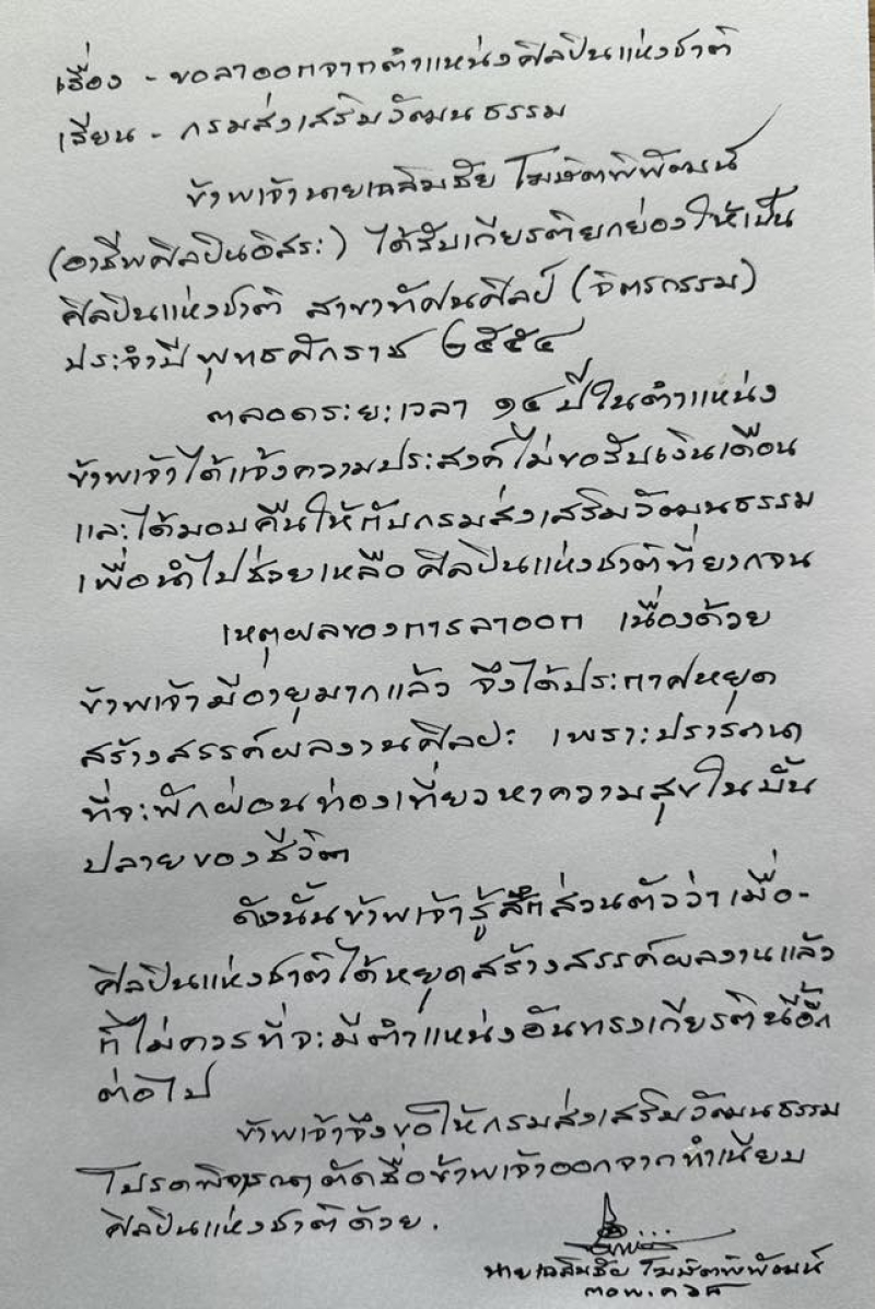 ก็ไม่ควรที่จะมีตำแหน่งอันทรงเกียรตินี้อีกต่อไป ข้าพเจ้าจึงขอให้กรมส่งเสริมวัฒนธรรม โปรดพิจารณาตัดชื่อข้าพเจ้าออกจากทำเนียบศิลปินแห่งชาติด้วย. นายเฉลิมชัย โฆษิตพิพัฒน์30 พ.ค. 68