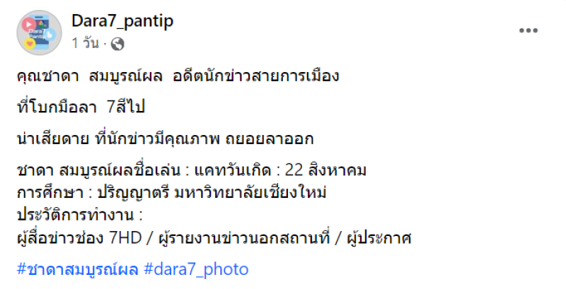 โดยทางเพจ Dara7_pantip ได้ออกมาเผยว่า คุณชาดา สมบูรณ์ผล อดีตนักข่าวสายการเมือง ที่โบกมือลา 7สีไป น่าเสียดาย ที่นักข่าวมีคุณภาพ ถยอยลาออก ชาดา สมบูรณ์ผลชื่อเล่น : แคทวันเกิด : 22 สิงหาคม การศึกษา : ปริญญาตรี มหาวิทยาลัยเชียงใหม่ ประวัติการทำงาน : ผู้สื่อข่าวช่อง 7HD / ผู้รายงานข่าวนอกสถานที่ / ผู้ประกาศ