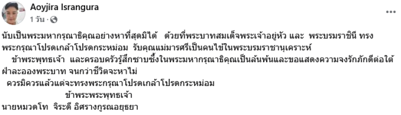 เขียนว่า นับเป็นพระมหากรุณาธิคุณอย่างหาที่สุดมิได้ ด้วยที่พระบาทสมเด็จพระเจ้าอยู่หัว และ พระบรมราชินี ทรงพระกรุณาโปรดเกล้าโปรดกระหม่อม รับคุณแม่มารศรีเป็นคนไข้ในพระบรมราชานุเคราะห์ ข้าพระพุทธเจ้า และครอบครัวรู้สึกซาบซึ้งในพระมหากรุณาธิคุณเป็นล้นพ้นและขอแสดงความจงรักภักดีต่อใต้ ฝ่าละอองพระบาท จนกว่าชีวิตจะหาไม่ ควรมิควรแล้วแต่จะทรงพระกรุณาโปรดเกล้าโปรดกระหม่อม ข้าพระพระพุทธเจ้า นายหมวดโท จิระดี อิศรางกูรณอยุธยา