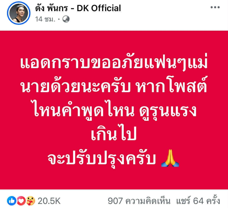 หลังจากโพสต์นี้ เพจ ดัง พันกร ก็ได้ออกมาขอโทษ และยอมรับคำแนะนำ พร้อมประกาศว่า จะปรับปรุงการทำงานของเพจให้ดียิ่งขึ้น
