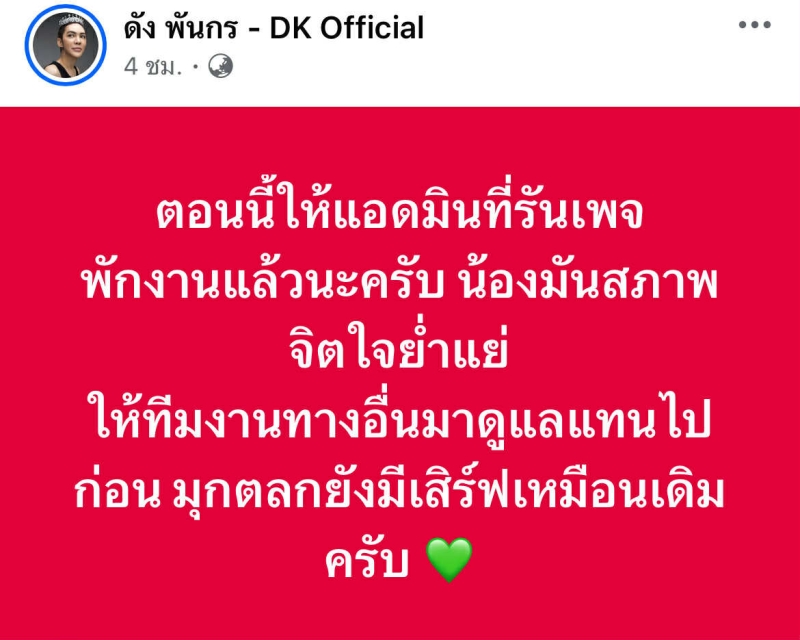 ต่อมา เพจเฟซบุ๊ก ดัง พันกร ได้อัปเดตสถานการณ์ว่า แอดมิน ที่รันเพจ ได้รับการพักงาน เนื่องจากสภาพจิตใจไม่ดี และให้ทีมงานอื่นดูแลแทน แต่คอนเทนต์ และมุกตลก จะยังคงมีให้แฟนๆ ได้ติดตามเหมือนเดิม