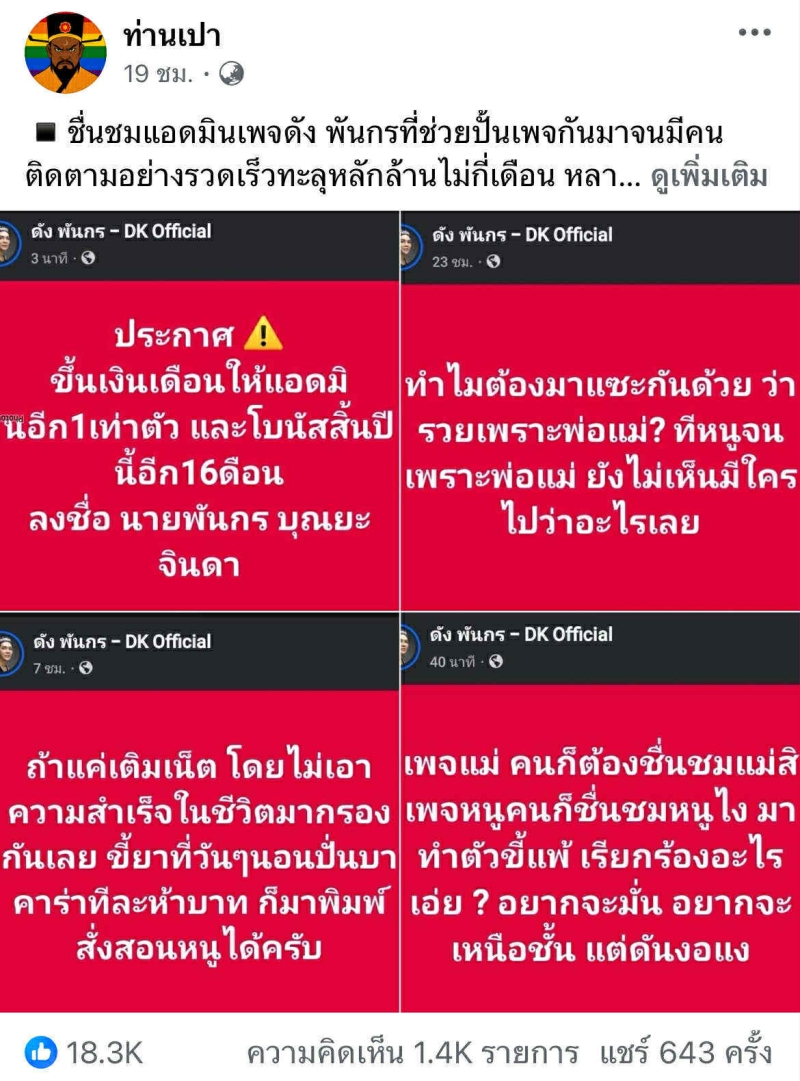 เรียกได้ว่า นาทีนี้ คงไม่มีใคร ไม่รู้จัก กับ ดัง พันกร ที่กลายเป็นประเด็นร้อนแรงในโลกออนไลน์ เมื่อเพจ ท่านเปา ได้โพสต์เตือนแอดมินของ เพจ ดัง พันกร หลังจากที่การนำเสนอคอนเทนต์ที่มีความขัดแย้งกับภาพลักษณ์ที่สร้างมา พร้อมระบุว่า เพจมีการฟาดจิกกัดจนเกินไป จนกลายเป็นการแซะ และการนำเสนอข้อมูลที่ไม่เหมาะสม แม้จะเป็นโพสต์สาธารณะ แต่ก็ต้องคำนึงถึงความเห็นต่าง และผลกระทบที่อาจเกิดขึ้นตามมา